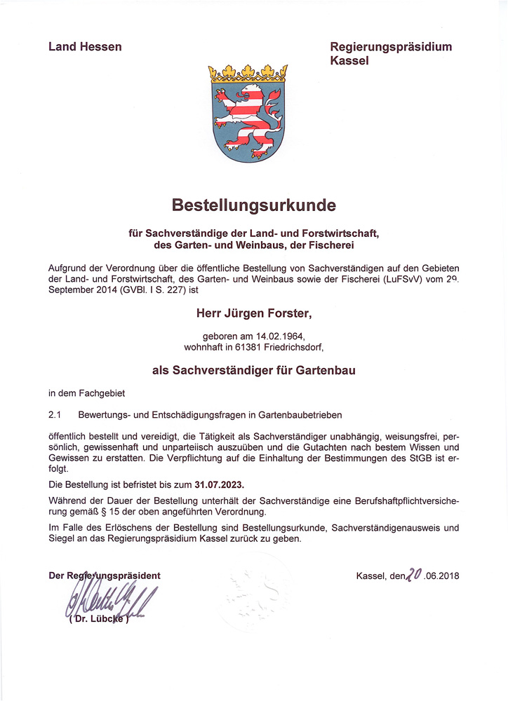 Bewertungs- und Entschädigungsfragen in allen Sparten des Gartenbaus an.